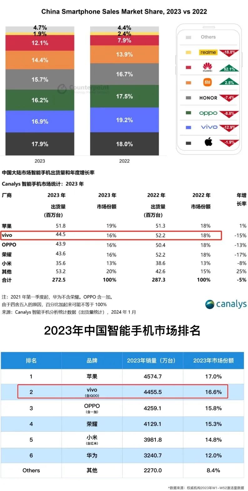 過去一周,各大市場研究機構報告陸續出爐。根據權威機構分享的2023年中國智能手機激活數據顯示,蘋果以17%的市場份額奪得第一,vivo緊隨其后以16.6%穩居第二,OPPO則以15.8%排名第三。Counterpoint與Canalys也隨后發布了中國智能手機市場出貨量排名。三家機構的榜單驗證了一個共同信息:2023年vivo成為國產份額第一的手機品牌。