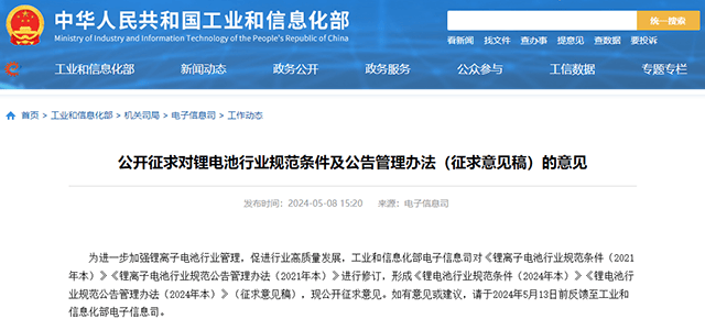 5月8日,工業和信息化部在官網上發布了一則重要消息——公開征集對鋰電池行業新規定的意見。這份名為《鋰電池行業規范條件及公告管理辦法》的征求意見稿,明確表示要鼓勵鋰電池制造商將焦點從盲目擴產轉向技術創新,以提高產品質量和降低生產成本。