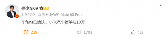 近日,有汽車博主在微博上曝料稱:車fans已確認,小米汽車鎖單破10萬。