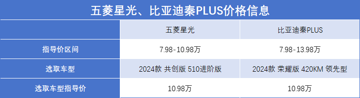 為了對比的公平性,咱們也選取兩臺車的價格接近的車型進行對比,并且咱們今天主要以純電版車型為例開展對比,即五菱星光 2024款 共創版 510進階版、秦PLUS 2024款 榮耀版 420KM 領先型(下文分別簡稱:星光EV、秦PLUS EV),二者的指導價均為10.98萬,咱們也以這兩款車型為例,展開對比。