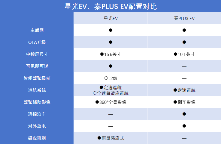 其次,星光EV和秦PLUS EV都能實現定速巡航功能,但星光EV還能選裝L2級智能駕駛輔助系統,在中長途出行過程中,便捷性要好一些;常規配置方面,星光EV多出了感應雨刷、360°全景影像功能。整體來看,星光EV的配置更為豐富,秦PLUS EV只能說是夠用。