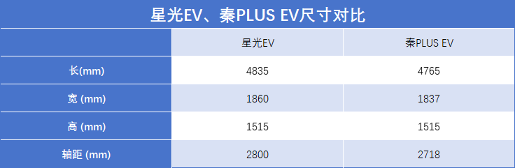 對于家用轎車而言,空間、載物能力是繞不開的環節,咱們也來看看星光EV、秦PLUS EV的具體表現。從尺寸來看,星光EV的長寬高分別為4835、1860、1515mm,軸距為2800mm,在緊湊型轎車中屬于中上游水平;秦PLUS EV的長寬高分別為4765、1837、1515mm,軸距為2718mm,屬于緊湊型轎車的標準尺寸。相比之下,星光EV的各項尺寸均有優勢,反映到實際空間上,星光EV的后排腿部空間及橫向空間都會比秦PLUS EV寬敞一些,更能滿足后排滿載的需求。
