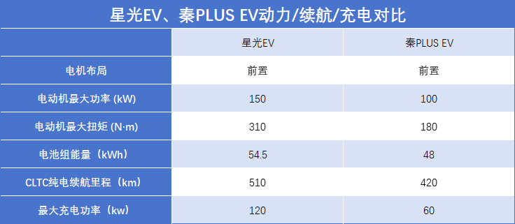 作為純電動車型,純電續航里程、動力表現,以及充電效率都是關鍵指標,咱們也來看看星光EV、秦PLUS EV的表現及差異。動力結構方面,星光EV、秦PLUS EV各自都配備了一臺前置驅動電機,而星光EV的電動機最大功率為150kW,最大扭矩為310N·m,秦PLUS EV的最大功率為100kW,最大扭矩為180N·m,星光EV的動力會有明顯優勢,應付國道、高速超車等場景,會更得心應手。同時,星光EV的最高車速為160km/h,秦PLUS EV僅為130km/h,前者的優勢依舊明顯。