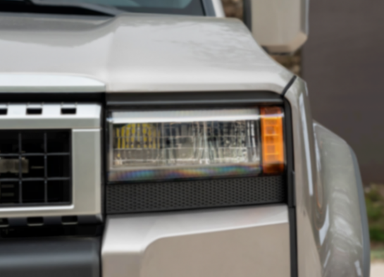 全新豐田普拉多第一眼給我的感覺還是比較硬核的,相比老款車型,更有野性,中網的白色TOYOTA字母LOGO也是比較醒目,格柵周邊還增加了銀色邊框作為點綴,大燈組采用矩陣式設計,大燈邊上的小黃燈也是比較復古,符合自身的定位,整體設計,符合一個硬派SUV該有的味道。