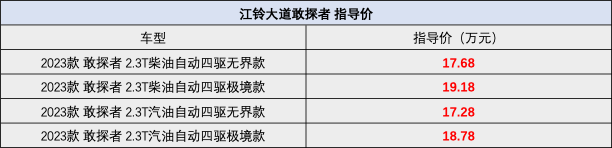 現(xiàn)款在售的江鈴大道敢探者共有4款車型,價格區(qū)間為17.28萬至19.18萬,包括2款柴油動力車型和2款汽油動力車型。值得一提的是,敢探者全系汽柴油動力車型均搭載2.3T+8AT的組合,在同級別車型中動力的優(yōu)勢還是很突出的。