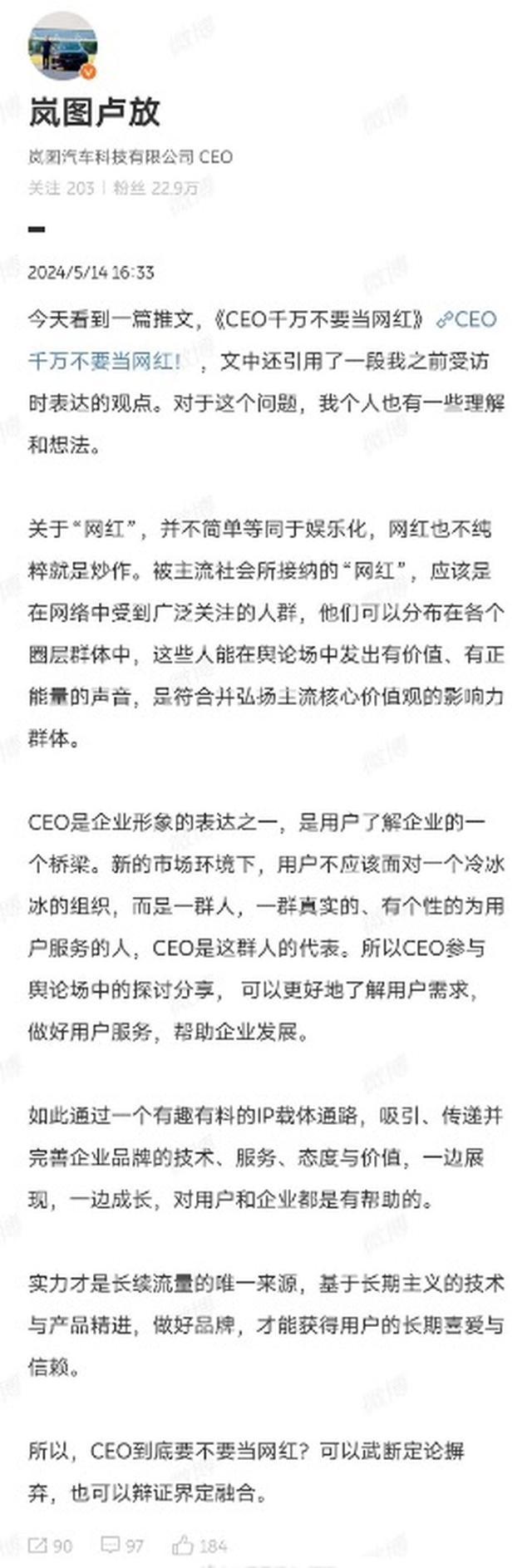 因此,車企CEO是不是該當網紅,其實很大程度還是得看適不適合,因為,流量是把雙刃劍。