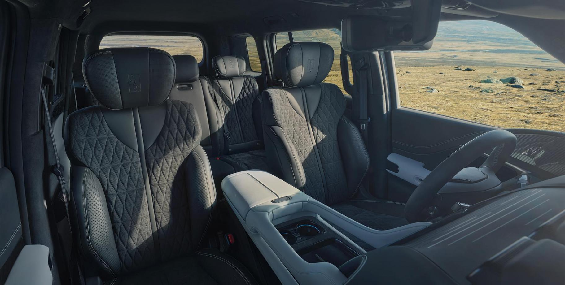 外觀顏色方面,提供砂石綠、曜石黑兩款車身色,和專屬黑綠內(nèi)飾配色,另外還提供黑色、銅色、紅色三種顏色的卡鉗。車身尺寸方面,新車長寬高分別為5325(含備胎)/2095/1940毫米,軸距為3050毫米,采用2+3的座椅布局,后備箱容積1031升,座椅放倒后可擴(kuò)展至2050升。同時(shí),其車頂配備可拆卸式的行李箱,能夠進(jìn)一步增大儲(chǔ)物空間,支持選裝無天窗不帶無人機(jī)艙和不同顏色無人機(jī)艙等配置。
