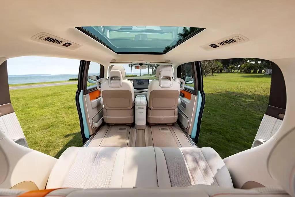 前面說到,極氪MIX沒有設置常規的B柱,因此前后排車門均支持側滑的打開方式,方便停在狹窄的停車位。此外,前排座椅支持270°電動轉向,中央扶手還能夠伸縮變為餐桌,可與后排座椅形成5座會客室式布局,可以說相當有特點。