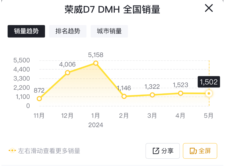 只是,讓人訝異的是,最新行業銷量數據顯示,2024年5月份,榮威D7 DMH的單月零售銷量卻僅為1502臺。