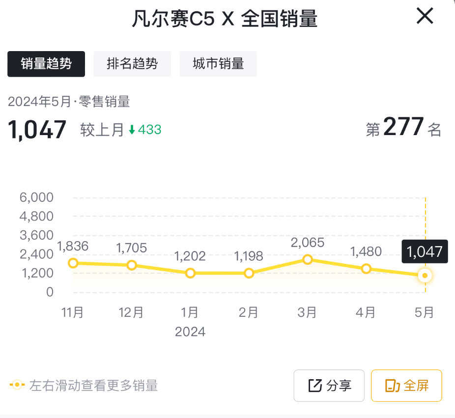 顯然,從銷量規(guī)模上看,2024年5月份,凡爾賽C5 X單月僅1000臺(tái)出頭的銷量規(guī)模,與上市之初形成了較大的反差。