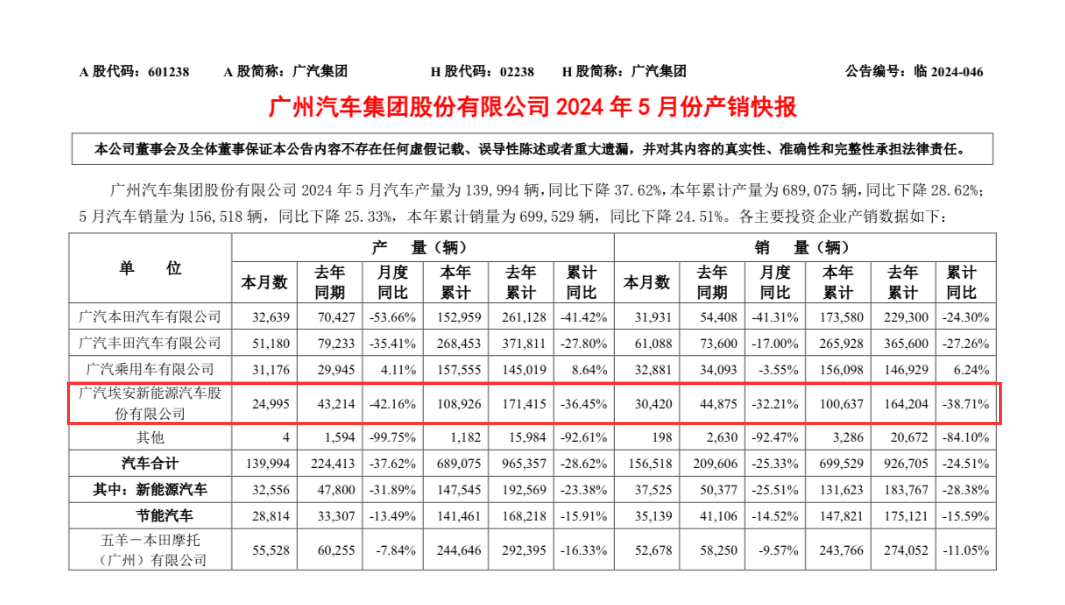 官方數(shù)據(jù)顯示,2024年1-5月份,廣汽埃安的銷量,相比去年同期,下滑了38.71%,幾乎下滑了四成。