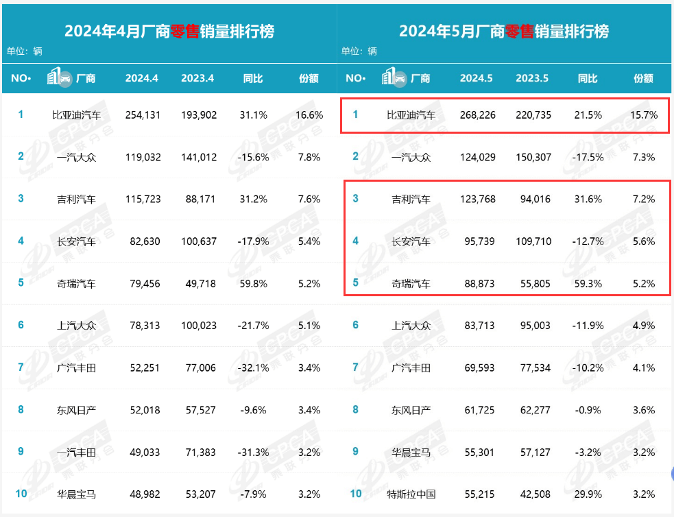 此前,在銷量規模方面,吉利汽車與長安汽車基本相當。值得注意的是,乘聯會數據的數據顯示,2024年5月份,在銷量前4名自主車企中,長安汽車也是唯一銷量下滑的車企。