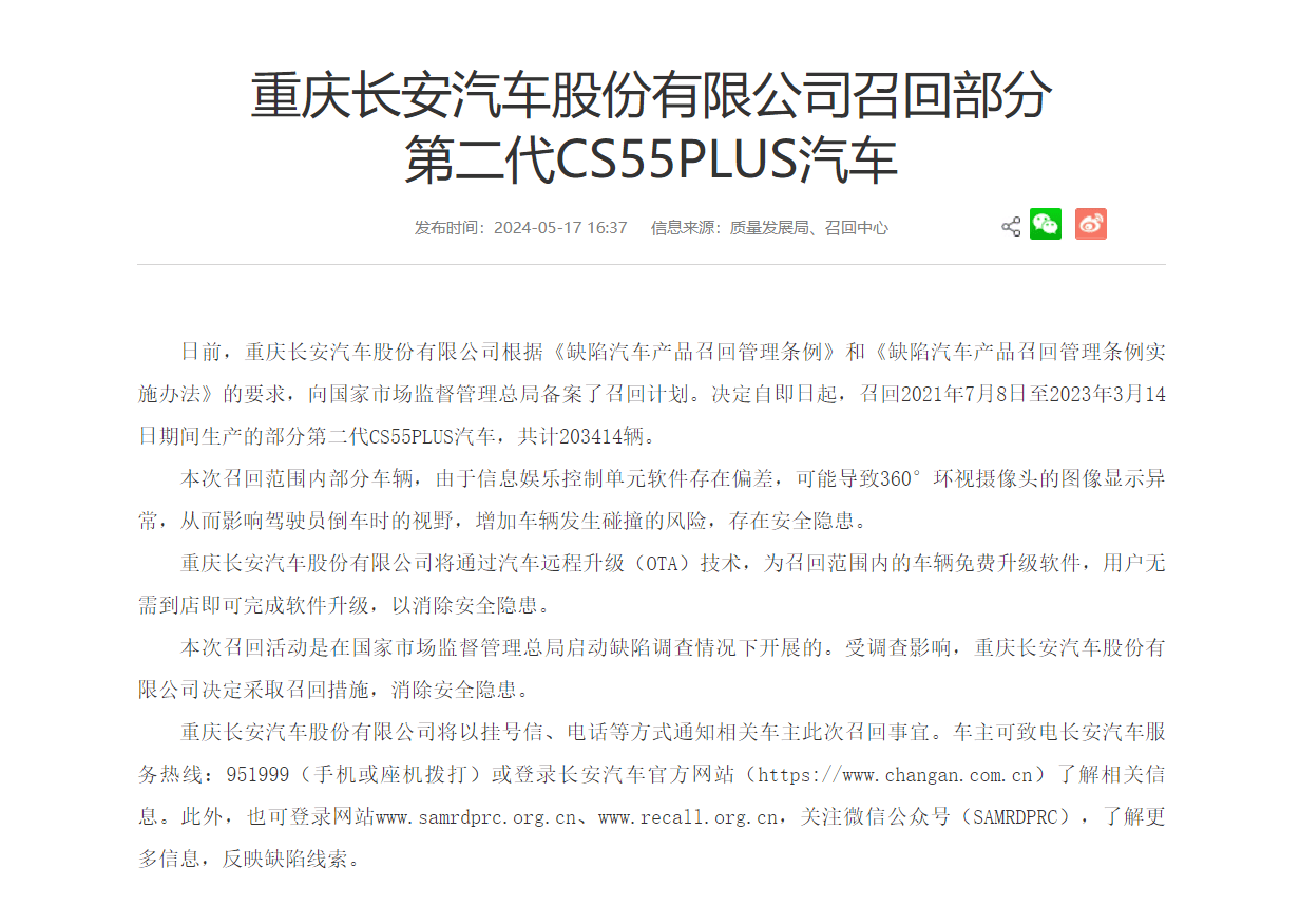 國家市場監(jiān)督管理總局官網(wǎng)消息顯示,2024年5月份,長安汽車共計(jì)召回了203414臺車型。