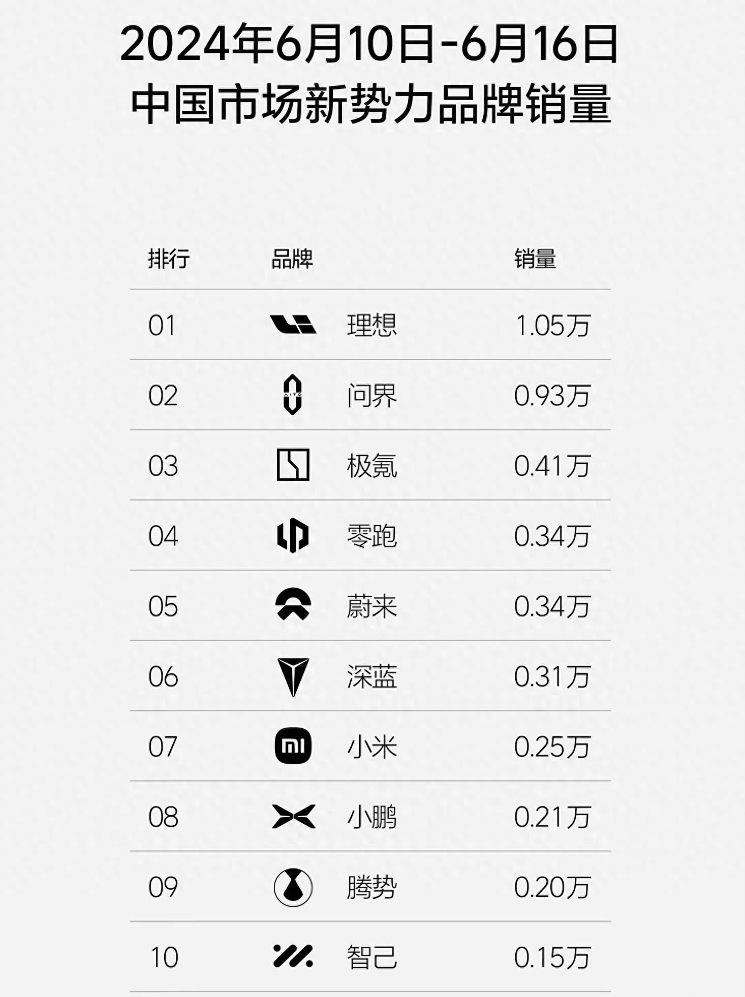 6月18日,理想汽車官方發布了2024年第24周(6.10-6.16)銷量榜單,毫無懸念,繼上一周問鼎銷量冠軍后,理想汽車本周銷量1.05萬輛蟬聯新勢力第一,連續兩周交付量過萬。