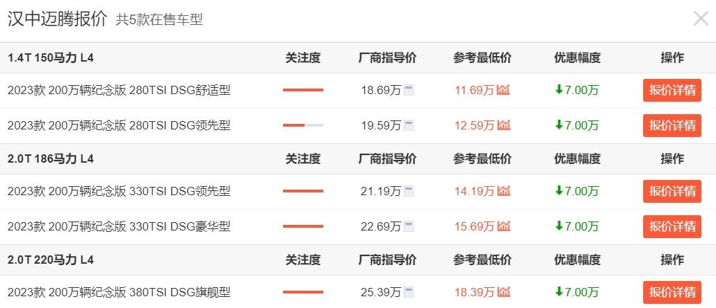 就以指導價18.69萬元的邁騰2023款 200萬輛紀念版 280TSI DSG舒適型為例,在優惠了7萬元之后,新車的參考最低價也是直接來到了11.69萬元。那花不到12萬的裸車價格就能夠買到一臺1.4T的邁騰,這買賣難道不劃算嗎?