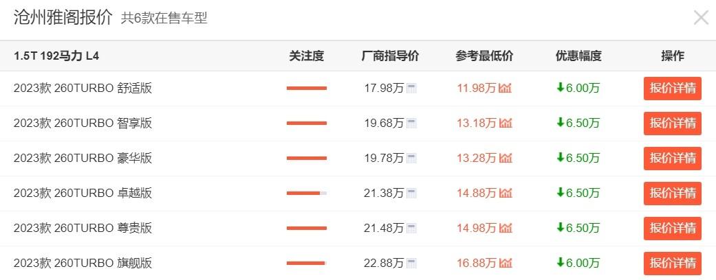 而其余車型則是都能優惠6.5萬,也就是說,即使你購買全系最頂配、售價22.88萬元的雅閣2023款 260 TURBO 旗艦版,其優惠完之后的價格也來到了16.88萬元,屬實是性價比很高的一款合資B級車了,強烈建議大家不要再錯過。
