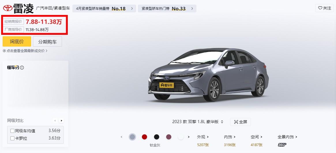 就以我們在網上獲取到的報價以及結合當地實際優惠情況來看,像豐田雷凌的1.5L最低配車型,眼下就已經跌到了7.88萬的價位區間。如果你是做貸款買車,那這里面的優惠可能還會有幾千元的浮動,這你受得了嗎?