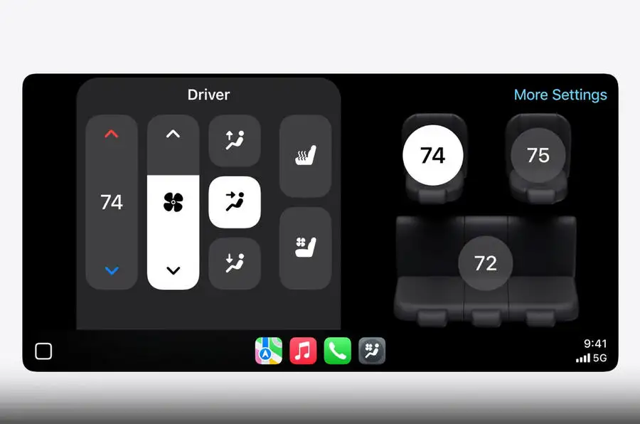 在該圖,顯示了車主用戶能在CarPlay2.0的中控顯示臺(tái)界面,直接進(jìn)行空調(diào)控制,包括空調(diào)風(fēng)速、風(fēng)向、溫度、座椅通風(fēng)、加熱、按摩。