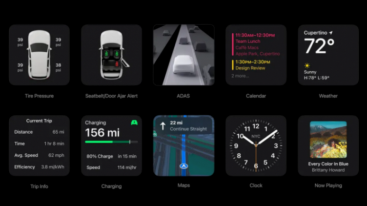 在這一張圖中,從左到右,從上到下,展示CarPlay2.0可顯示輪胎壓力、安全帶未系提醒&開門碰撞警告、ADAS、日歷日程、天氣狀況、里程信息、充電狀態(tài)、地圖導(dǎo)航、時(shí)間鬧鐘、正在播放。