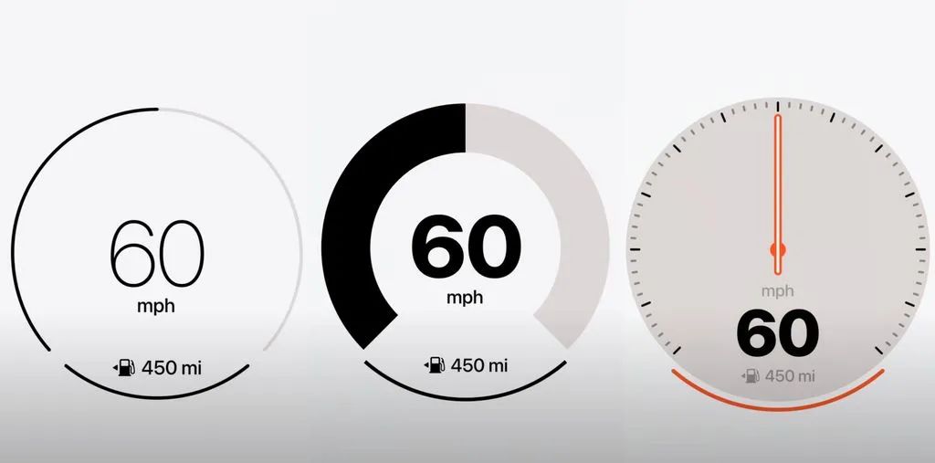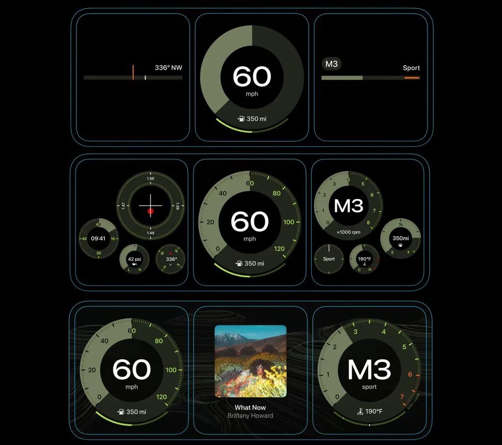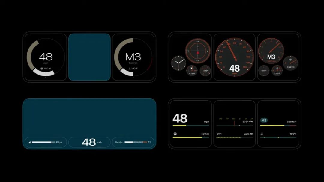 在該圖,蘋果允許用戶自定義設(shè)置自己喜歡汽車儀表表盤樣式,這只是列舉的四種,實(shí)際可選擇更多,看廠商和蘋果怎么匹配開發(fā)定義。