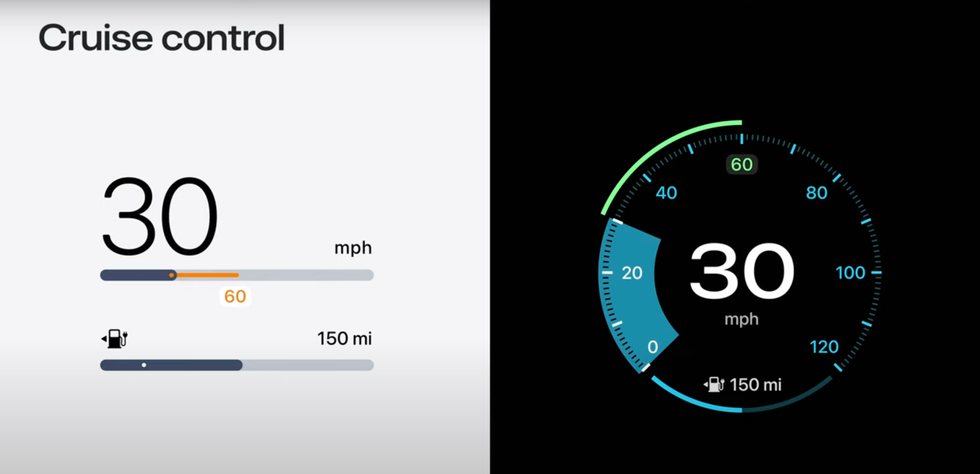 如上圖,CarPlay2.0允許用戶車輛的儀表盤進(jìn)行自定義設(shè)置,車輛開啟ACC自適應(yīng)巡航控制時(shí),顯示當(dāng)前速度及設(shè)置的最高限速值,還有車輛剩余續(xù)航里程表,圖片左右兩邊是兩種不同的顯示風(fēng)格,左邊現(xiàn)代,右邊傳統(tǒng)。