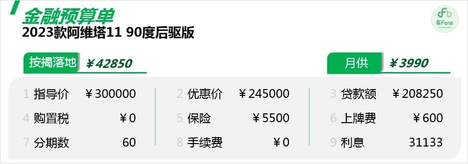 以23款標配為例,首付15%、分期5年、年華費率2.99%,為大家做個金融預算單: