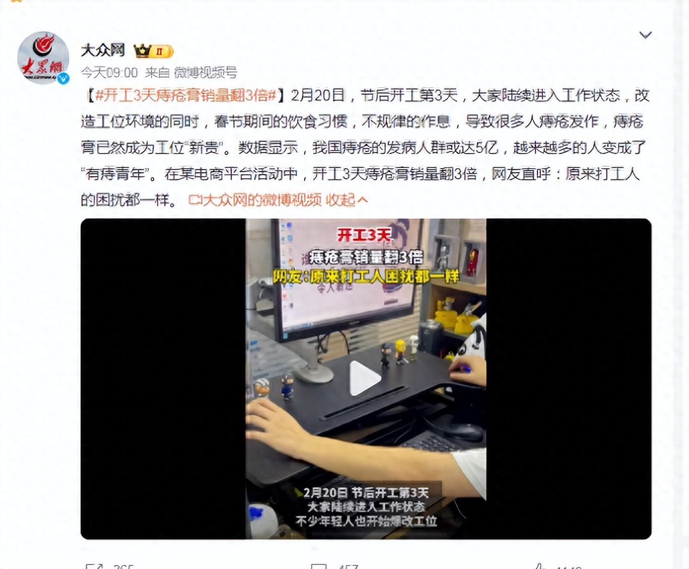 在某大型電商平臺的開工促銷活動中,痔瘡膏的銷量在短短三天內就翻了三倍。這一現象迅速引發了網友們的關注和討論。有人調侃道:“看來大家都是在‘痛并快樂著’中開始新一年的工作啊!”也有人表示擔憂:“這么多人都受痔瘡困擾,是不是應該更加重視預防和治療呢?”
