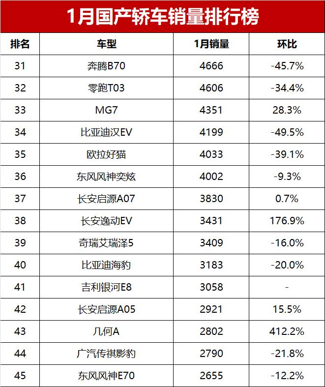 1月份上市的吉利銀河E8,當月銷量為3058輛,排名第41位。長安啟源A05緊隨其后,以2921輛的銷量排名第42位。