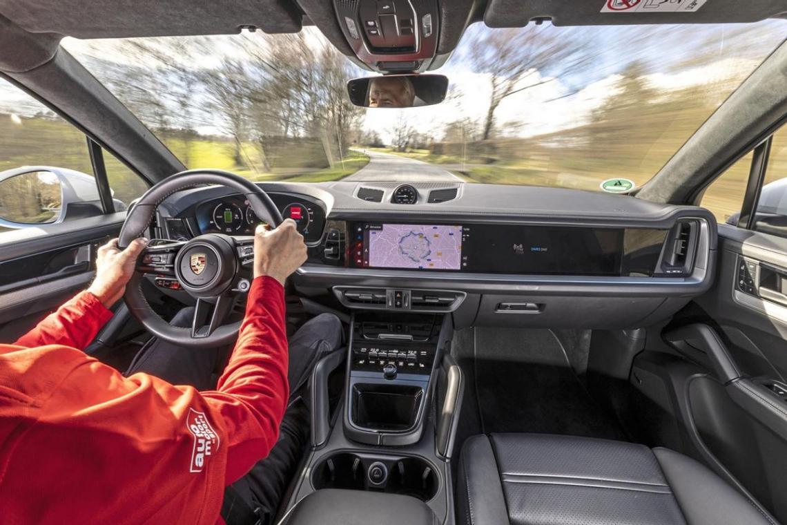 新款Cayenne也不具備這項功能,盡管六缸發動機在保時捷中扮演著核心角色。其轉速表始終位于數字儀表的中心,并通過抬頭顯示功能映射在前擋風玻璃上。不過,在最開始的79公里行駛中,動畫指針始終停留在起始位置,因為在這個距離內Cayenne會依靠其功率為130千瓦、460牛·米的電動機進行純電驅動。