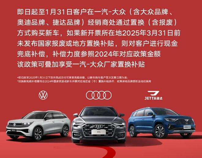 一汽-大眾也推出了補(bǔ)貼政策,含大眾品牌奧迪品牌、捷達(dá)品牌。 即日起至 1月31 日,購買一汽奧迪的用戶除享受購車地方補(bǔ)貼外可享受至高 2.45萬元疊加置換補(bǔ)貼。