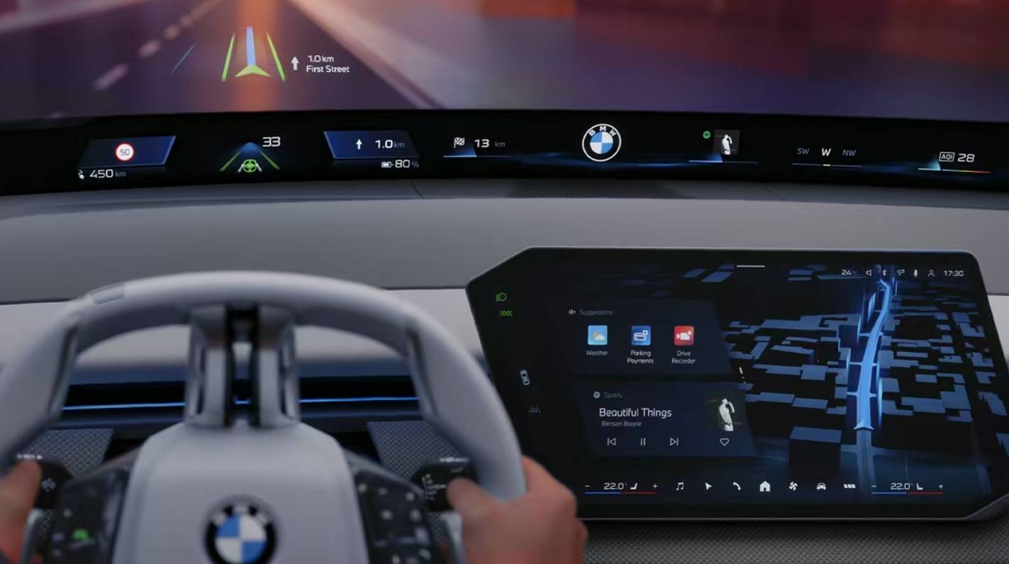 據官方介紹,此次BMW新世代車型放棄了傳統儀表盤,取而代之是用A柱到A柱超1米寬的超寬視域視平線全景顯示投影。全景顯示圖像可實現100000:1的圖像對比度及4K級清晰度,創新應用的寶馬“專供”納米涂層玻璃,確保全景投影圖像讓所有座位用戶都能清晰看見,且不受偏光墨鏡影響。此外,投影圖像更呈現3D景深效果,幾乎與路面平齊。同時,駕駛員視野內沒有遠端物理屏或傳統儀表盤的遮擋,讓駕駛員視覺焦點始終聚焦前方,駕駛更專注,信息更聚焦。