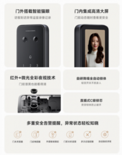 該產品還搭載新一代智能貓眼,無論身在何處都可隨時隨地查看門前動態,內置 AI 人形檢測算法,有人靠近逗留時自動錄像通知。內門鎖嵌入可視大屏,訪客按鈴后門內屏幕可自動亮起,還可隨時喚醒屏幕,查看門前異常情況。