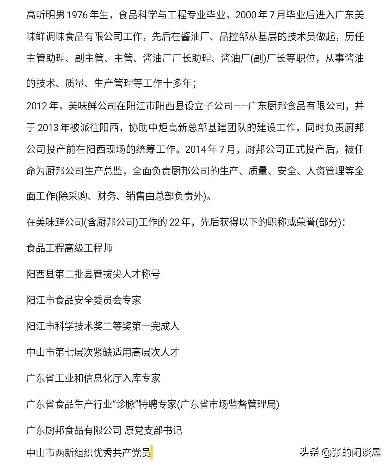 舉報(bào)人在美味鮮公司(含廚邦公司)工作的22年,其個(gè)人介紹: