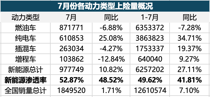 2025下半年剛開啟,中國(guó)車市就出現(xiàn)新變化。今年7月,國(guó)內(nèi)乘用車市場(chǎng)新車上險(xiǎn)量總計(jì)185萬輛,同比微漲1.7%。其中自主品牌陣營(yíng)同比增長(zhǎng)11%,海外品牌同比下滑11.5%,兩大陣營(yíng)冰火兩重天。而更關(guān)鍵的變化則是新能源滲透率,終于打破了持續(xù)一年的僵持局面,國(guó)內(nèi)市場(chǎng)新能源滲透率首次超過50%是在去年8月,且當(dāng)月直接飆到了51.05%。時(shí)隔11個(gè)月之后,新能源滲透率在今年7月終于再次突破,達(dá)到了52.87%,相較6月份直接增長(zhǎng)了1.1個(gè)百分點(diǎn)。