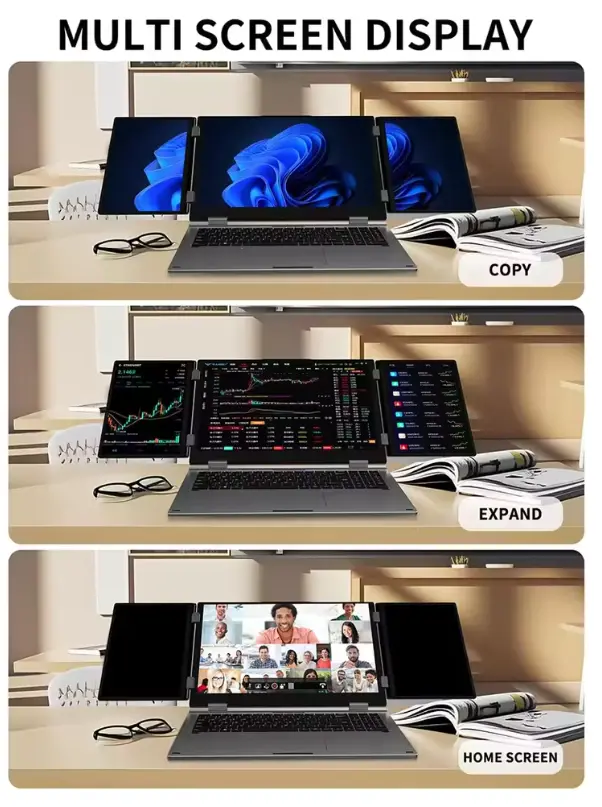 根據(jù)商品詳情頁介紹,這款筆記本配備一塊 16 英寸主屏 + 兩塊 10.5 英寸副屏,主屏分辨率為 1920*1200;兩塊副屏分別置于 B 面左、右側(cè),分辨率均為 1080*1920,均配備有鉸鏈,可在外出攜帶時(shí)折疊進(jìn) B 面內(nèi)。