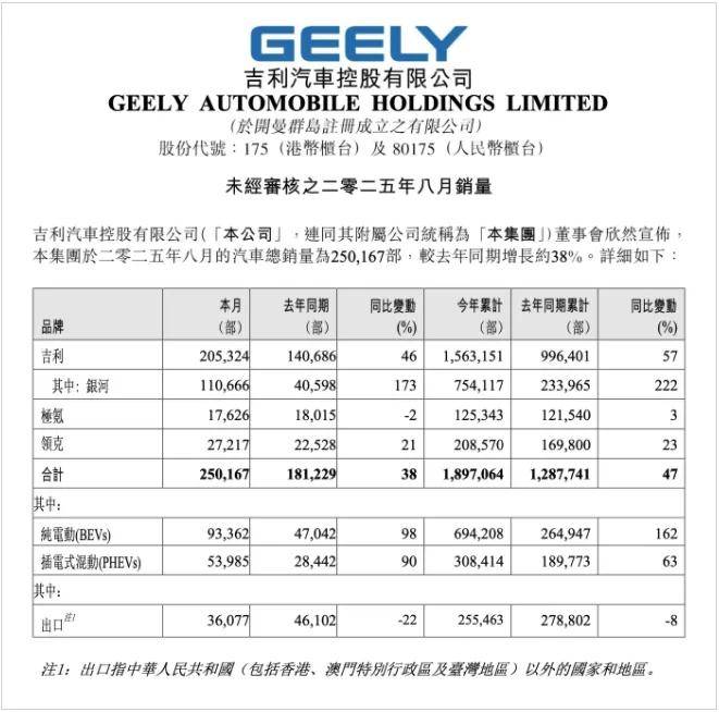 吉利汽車依然交出漂亮“成績單”,該品牌8月銷量達25.02萬輛,同比增長38%,這是吉利汽車連續第12個月單月銷量突破20萬輛大關。新能源領域表現更為突出,純電動汽車銷量9.34萬輛,同比增長98%;插電式混動汽車銷量5.40萬輛,同比增長90%。
