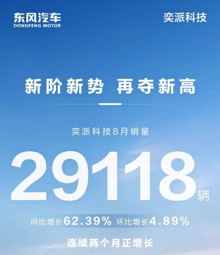 東風奕派科技的銷售成績也足夠引人注目。奕派科技8月交付29118輛,同比增長62.39%。對于這份“暴漲”的成績單,有人將其形容為“黑馬”,畢竟奕派過往表現并不出挑,單月近3萬的銷量的確不俗。