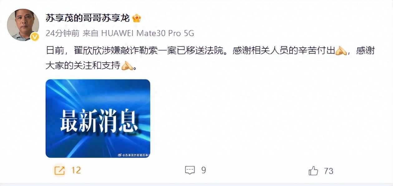 一場由婚戀引發(fā)的悲劇,如今再度掀起輿論的波瀾。3月7日,微博ID“蘇享茂的哥哥蘇享龍”發(fā)布了一條重磅消息:翟欣欣涉嫌敲詐勒索一案,已正式移送法院。這一消息迅速在社交媒體上發(fā)酵,引發(fā)了廣大網(wǎng)友的關(guān)注和熱議。
