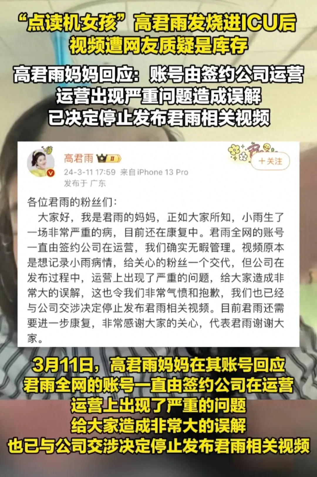 一時(shí)之間,網(wǎng)絡(luò)風(fēng)評集體倒向,本來關(guān)心高君雨病情的網(wǎng)友們都感覺自己被騙了,紛紛指責(zé)高君雨欺騙大家。真相曝光后,高君雨媽媽趕緊出來道歉,首先說明高君雨確實(shí)是很早之前做過手術(shù)了,只是高君雨的全網(wǎng)賬號都是由MCN機(jī)構(gòu)運(yùn)營的,自己對此一無所知,也感到十分氣憤。