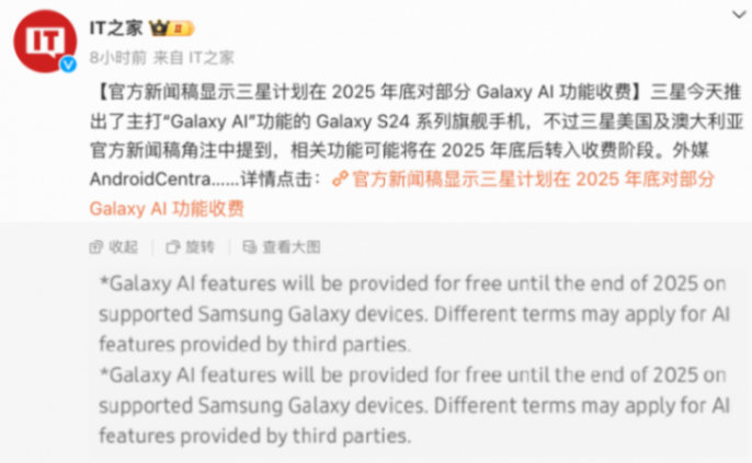 不過,來自IT之家的一份報道顯示:三星主打 Galaxy AI 功能的 Galaxy S24 系列旗艦手機,相關功能可能會在 2025 年底后轉入收費階段。