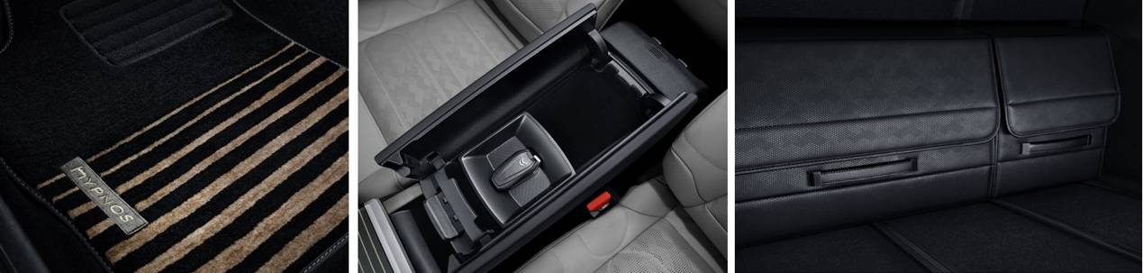 可卷縮式行李箱隔板+行李箱地板帶導軌+行李箱不銹鋼門檻裝飾件+行李箱電源,以及專屬HYPNOS舒緩腳墊、雙格中央扶 手置物箱、行李箱收納箱,設計別具匠心,分置有序,精心配置你的旅程規劃,無論多大的旅程夢想,統統裝下。