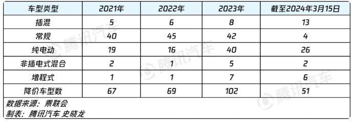 根據騰訊汽車和乘聯會的統計數據,截止今年3月15日,參與降價的車型數量達到了51款,相當于2023年全年降價車型數量的一半,馬上就要趕上2022年和2023年的全年數量了。而這僅僅是今年一季度的數據,如果某些品牌降價促銷的目標沒有達成,市場競爭依然激烈,后續有可能還有很多車型將降價,今年參與降價的車型數量刷新紀錄的同時,大概率會有一個令很多看后瞠目結舌的結果。