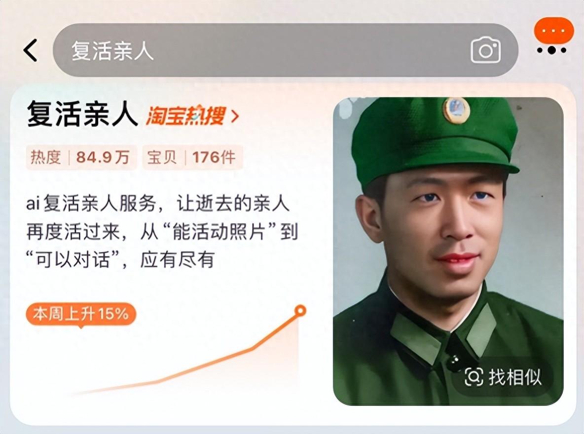 清明節(jié)將近,不少人通過各種形式來懷念自己故去的親人,AI等新技術(shù)的普及發(fā)展也給了人們更多的可能性。近期,在淘寶上搜索“復(fù)活親人”的人數(shù)暴漲605%,沖上淘寶熱搜,相關(guān)商品從“讓照片動起來”到“可以開口說話”,更高階的還有定制的AI數(shù)字人形象。