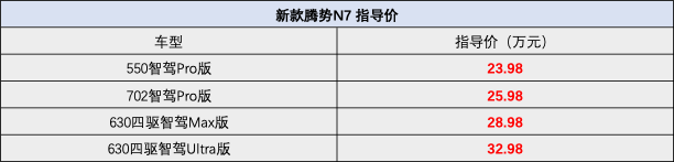 新款騰勢N7在4月1日這天迎來了上市,共發(fā)布了4款車型,指導價區(qū)間為23.98萬至32.98萬,相較于老款車型30.18萬的起售價,直接降了6.2萬,不過新款的入門款車型純電續(xù)航為550km,而老款車型的續(xù)航為702km。